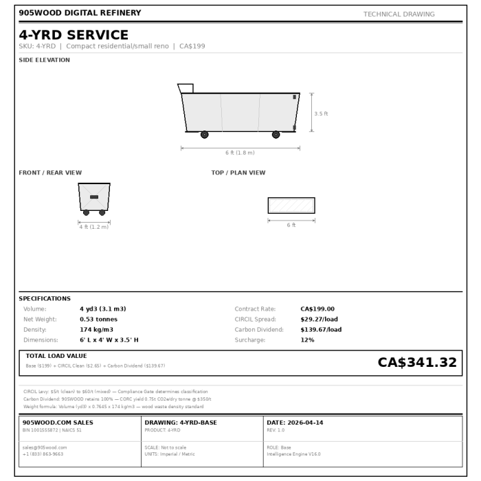 Every 4-yard bin rental includes delivery to your site, a flexible rental period, pickup when you're done, and a verified Diversion Pass documenting your load's recycling chain of custody. All wood waste is processed through 905WOOD's Digital Refinery workflow, achieving 60%+ verified diversion rates — far above the industry average of 15-25%.