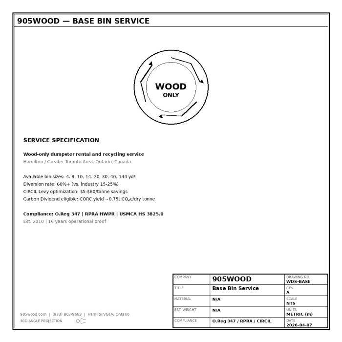 Ontario's only wood-only dumpster rental specialist since 2010. While mixed-waste haulers send recyclable wood to landfill, 905WOOD processes clean wood into pyrogenic biocarbon feedstock — keeping material in the circular economy and generating verified Carbon Dividends. 60%+ diversion rates, O.Reg 347 compliance, and RPRA-registered manifesting standard on every load.
