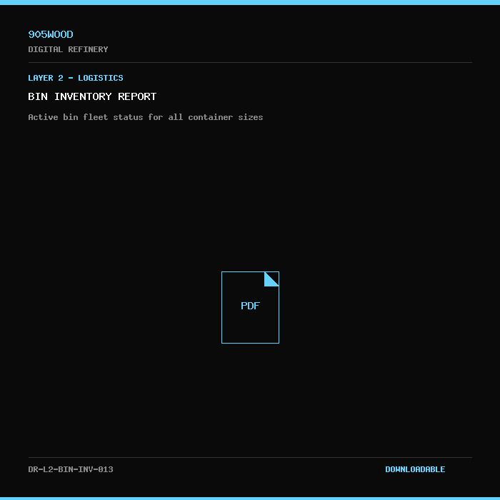 The Bin Inventory Report provides a real-time snapshot of 905WOOD's active container fleet across three standard sizes: 20-yard bins (~2,660 kg capacity), 40-yard bins (~5,320 kg capacity), and 144-yard Walking Floor trailers (~18,800 kg capacity). This asset tracking enables optimal bin allocation, reduces deployment gaps, and maximizes fleet utilization.
