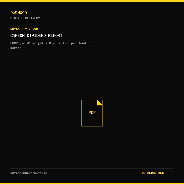 The Carbon Dividend Report quantifies the carbon removal value generated by each load of clean wood waste diverted from landfill into the pyrogenic biocarbon pathway. Using the formula Weight (tonnes) × 0.75 (CORC yield factor) × $350 (market price per tonne CO₂e), this report translates operational waste diversion into quantified climate impact and revenue potential.