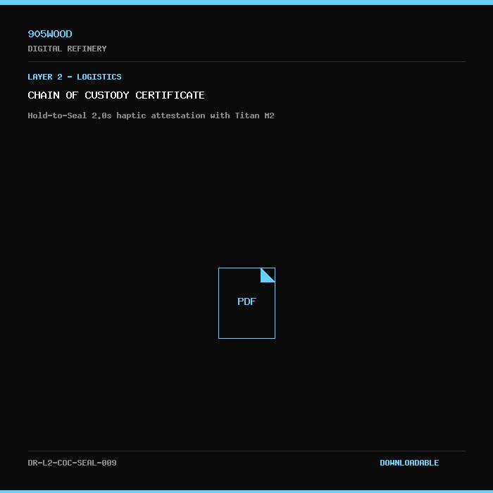 Each certificate is bound through the Hold-to-Seal protocol: a 2.0-second haptic press on the Pixel 10 Pro triggers a hardware attestation via the Titan M2 security chip. This creates a non-repudiable timestamp and device identity binding that cannot be spoofed, forged, or post-dated. The Titan M2 attestation serves as the cryptographic anchor for the entire chain of custody.