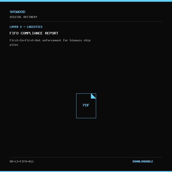 The FIFO Compliance Report documents the First-In-First-Out processing enforcement for wood waste chip piles at 905WOOD processing hubs. FIFO management is not merely an inventory best practice in biomass operations — it is a critical safety protocol that prevents spontaneous combustion, one of the most severe operational failure modes in the wood waste processing industry.