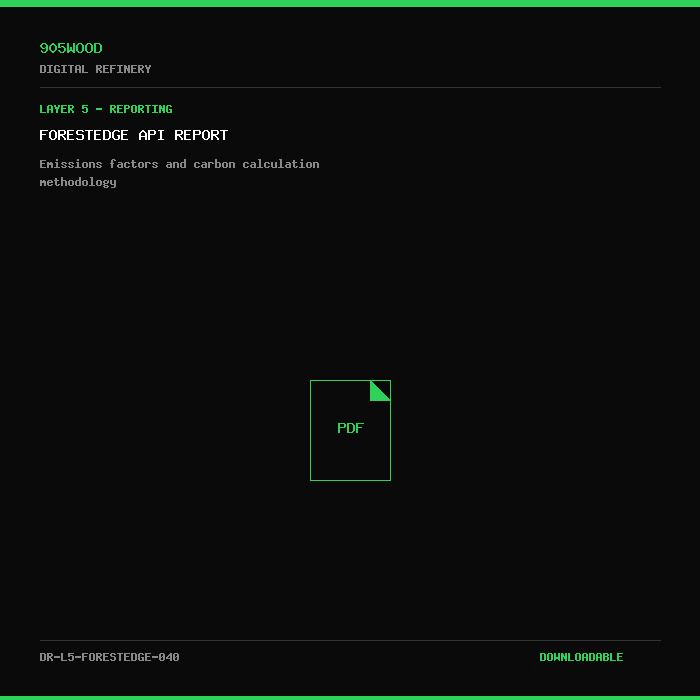 The ForestEdge API Report documents the emissions factors, calculation methodologies, and data sources used to generate carbon accounting outputs within the Digital Refinery ecosystem. ForestEdge provides the standardized reference data that underpins CORC yield calculations, Scope 3 emissions reporting, and Carbon Dividend computations.