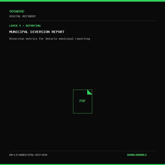 The Municipal Diversion Report is formatted specifically for Ontario municipal waste management reporting requirements, demonstrating 905WOOD's industry-leading 60%+ diversion rate for construction wood waste — roughly triple the industry average of 15-25%. This report supports municipal waste diversion targets and provides the quantitative evidence needed for council presentations and provincial reporting.