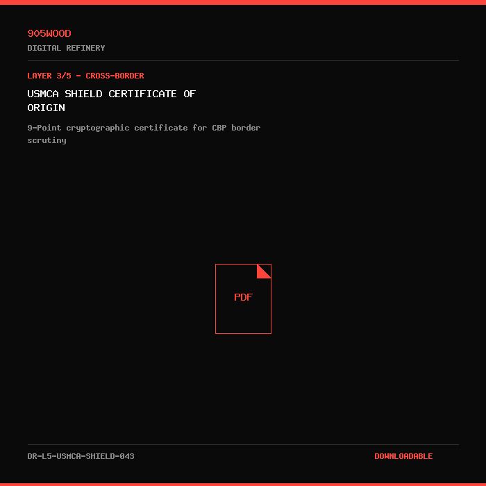The USMCA Shield is 905WOOD's cryptographic Certificate of Origin designed specifically for wood waste shipments crossing the Ontario-Michigan border. With Ontario exporting 3.44 million tonnes of waste annually to Michigan — and the July 2026 USMCA Joint Review approaching — having bulletproof border documentation is the difference between smooth transit and a 40% transshipment penalty surcharge under Section 122.